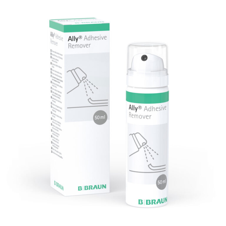 spray pour adhésif médical à base de silicone qui permet d'enlever doucement et sans douleur les produits adhésifs, tels que les poches pour stomie et les pansements ;