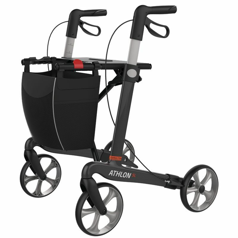 Rollator en carbone et aluminium lui garantissant rigidité, robustesse et légèreté ;