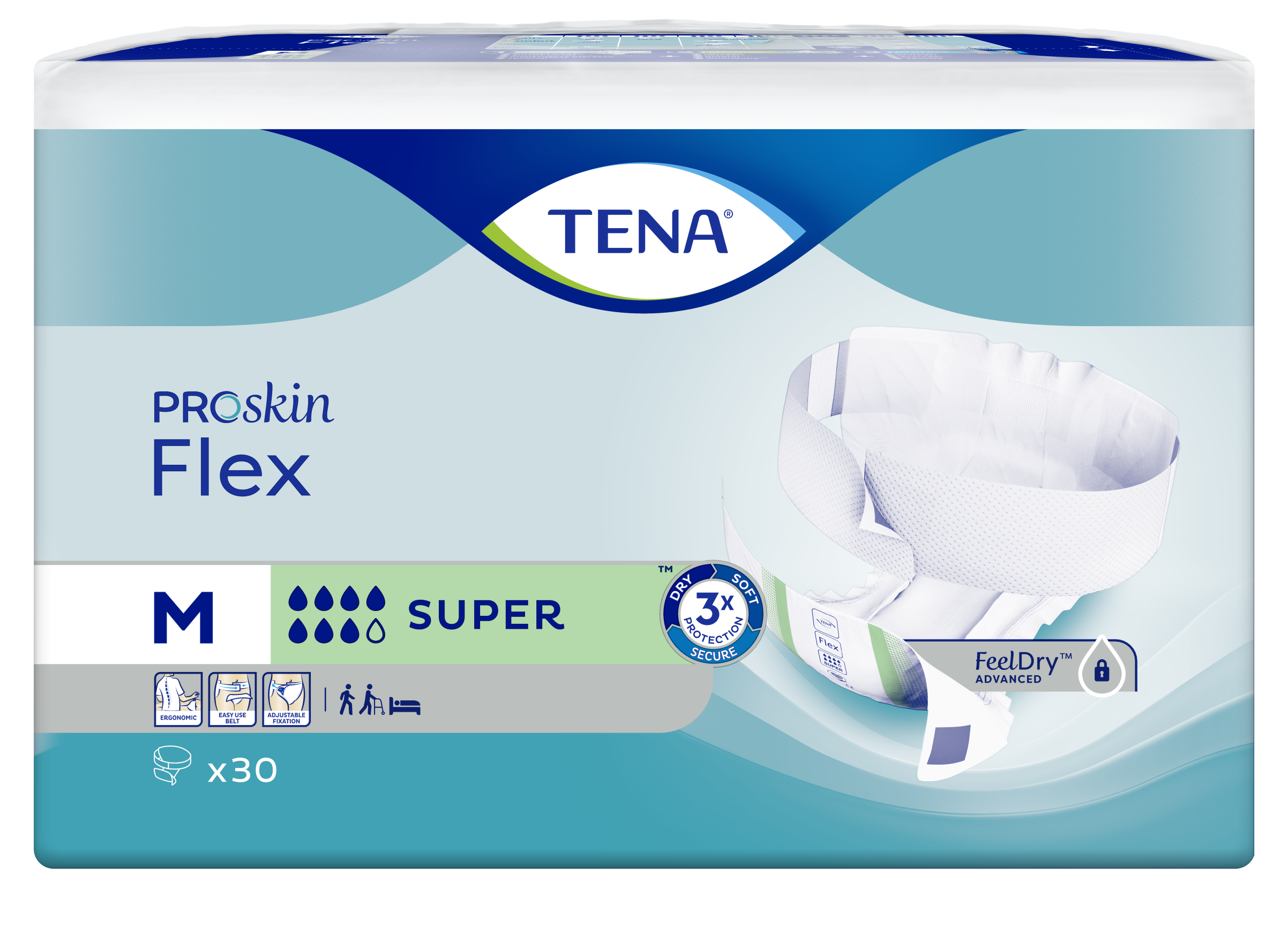 - TENA Flex ProSkin est un change complet avec ceinture pour fuites modérées à fortes ;